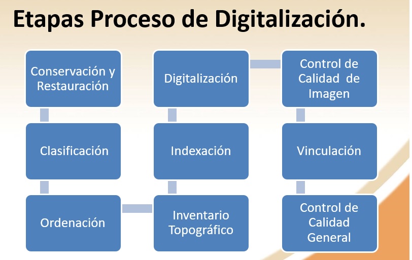 - Digitalización: En esta etapa los documentos son digitalizados en formato tiff sin compresión a 300 DPI, se escoge este formato ya que para garantizar la preservación la imagen sin perder calidad. Para este proceso se utilizan scanner cenitales, los cuales no maltratan los documentos.